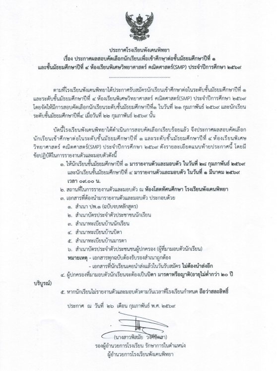 ประกาศรายชื่อผู้มีสิทธิ์สอบคัดเลือกเข้าศึกษาต่อ (ห้องเรียนพิเศษ SMP) ปีการศึกษา 2569