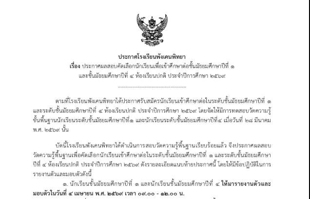 ประกาศผลการสอบคัดเลือกและห้องเรียน(ห้องเรียนปกติ) ปีการศึกษา ๒๕๖๙
