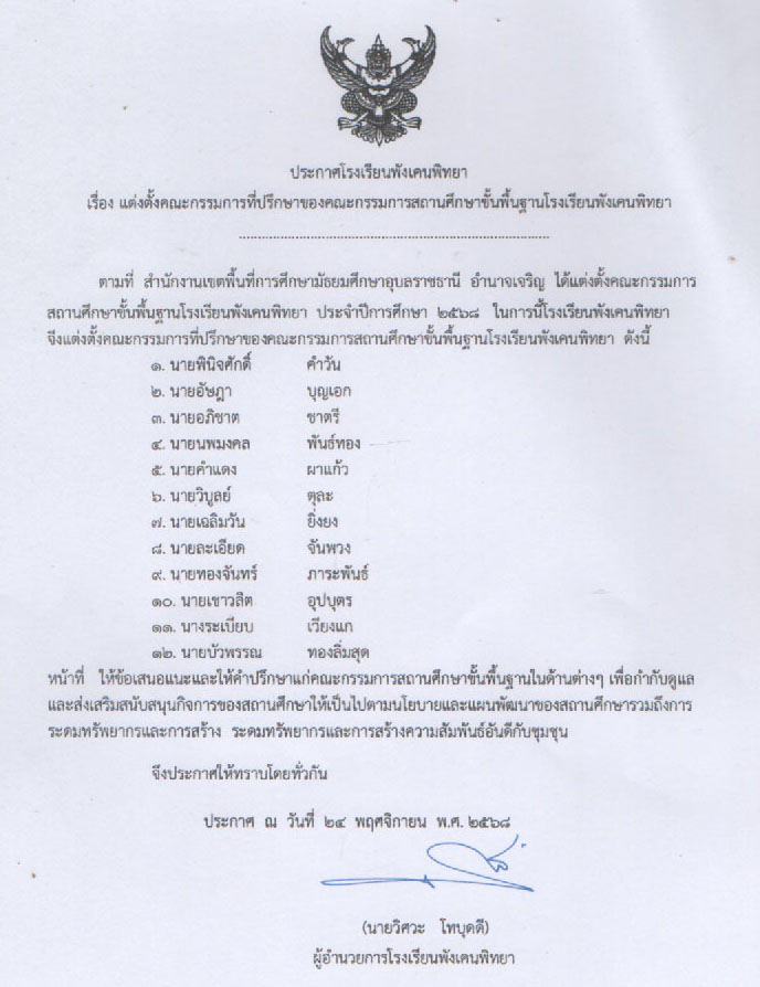 ประกาศแต่งตั้งคณะกรรมการที่ปรึกษาของคณะกรรมการสถานศึกษาขั้นพื้นฐานโรงเรียนพังเคนพิทยา